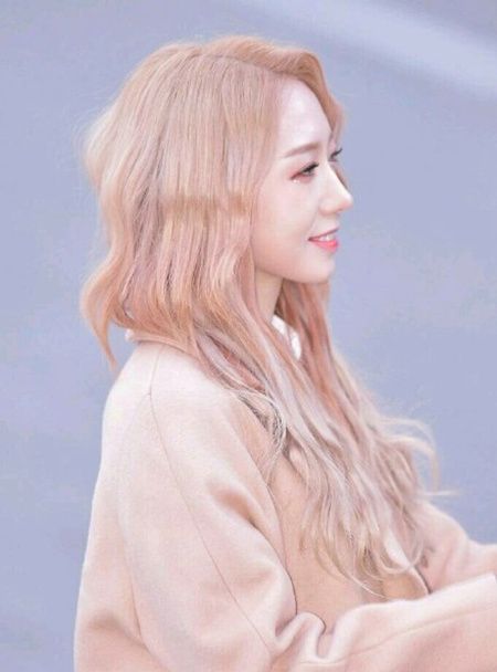这款发色在灯光下也会呈现出玫瑰粉金的效果,颜色偏粉减龄更显白。有时候明星发色变化很大,跟灯光也有很大的关系呢。