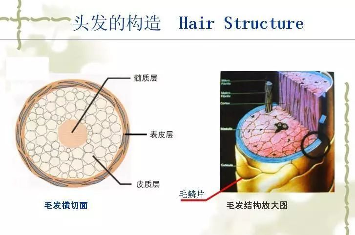 我们的头发绝大部分都是毛干,横截面切开看主要由毛髓质、毛皮质和最外层毛小皮组成。