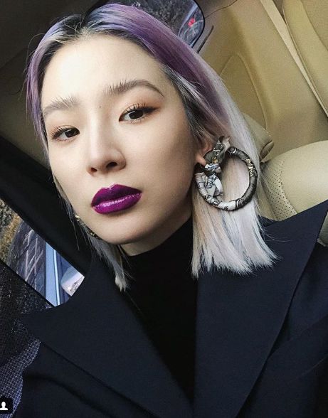 之前机场街拍中的造型,头发颜色偏玫瑰紫,没那么张扬,但也是蛮抬肤色的。