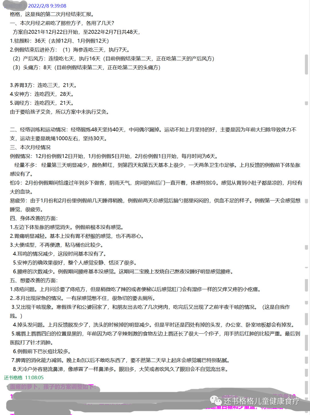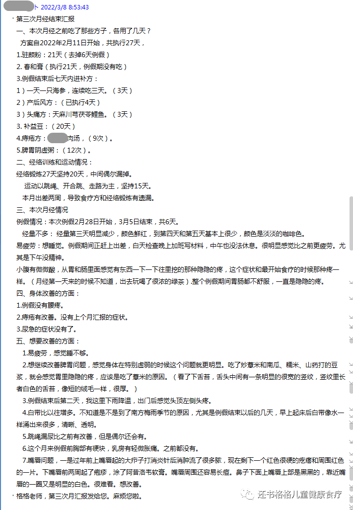 格格,这是我的第二次月经结束汇报。一、本次月经之前吃了那些方子,各用了几天?方案自2021年12月22日开始,至2022年2月7日共48天,1.驻颜粉:36天(去掉12月、1月例假12天)2.例假结束后进补方:(1)海参连吃三天,执行7天。(2)产后风方:连续吃七天,执行16天(目前例假结束第二天,正在吃第二天的产后风方)(3)头痛方:8天(目前例假结束第二天,正在吃第二天的头痛方)3.养胃3方:连吃三天,21天。4.安神方:连吃四天,28天。5.调经方:连吃四天,21天。由于要给孩子艾灸,所以方案中未执行艾灸。二、经络训练和运动情况:经络锻炼48天坚持40天,中间偶尔漏掉。运动不如上月坚持的好,主要是因为年前大扫除导致体力不支,运动主要是跳绳1000左右,坚持30天。三、本次月经情况例假情况:12月份例假12日开始,1月份例假5日开始,2月份例假1日开始,每月时间为6天。经量不多: 经量第三天明显减少,颜色鲜红,到第四天和第五天基本上很少,一天两条卫生巾足够。上月反馈的例假前下体坠胀感没有了。怕冷:2月份例假期间恰逢过年到乡下做客,阴雨天气,房间的前后门一直开着,体感特别冷。感觉从胃到小肚子都是凉的,月经有大的血块。易疲劳:由于1月份和2月份里例假前几天睡得稍晚,例假前两天总感觉后脑勺那里闷闷的,供血不足的样子。例假第一天会感觉想睡觉,很疲劳。四、身体改善的方面:1.左边下体坠胀的感觉消失。例假前根本没有感觉。2.胃痛明显减轻。基本上没有胃不舒服的感觉,也不再恶心。3.大便成型,不再便溏,粘马桶也比较少。4.耳鸣的情况减少,这段时间基本没有了。5.安神方的确效果很好,整个人感觉安静、恬淡了很多。6.腰疼的次数减少。例假期间腰疼基本没感觉。这期间二宝晚上发烧自己熬夜没睡好明显感觉腰疼。五、想要改善的方面:1.痔疮问题。上月问诊要了痔疮方,但是稍微吃了辣的或者便秘以后感觉肛门会有湿疹一样的又痒又疼的小疙瘩。2..本月出现尿急的情况。一有尿感觉憋不住,很急切的要去厕所。3.又出现干咳现象。寒假孩子和公婆回家了,和朋友出去吃了几次烤肉,吃完后又出现了之前半夜干咳的情况。(这是自我作践。)4.掉头发问题。上月反馈脱发少了,洗头的时候掉的明显减少。但是平时还是四处有掉的头发,办公室、卧室地板都会有掉发。5.嘴唇上唇唇四白的位置是黑的,年前因为吃了辛辣刺激的食物左边上唇还长了很大一个疖子,用手挤后红肿的比较严重。最后到医院打了针才消肿。6.例假前下巴长痘比较多。7.脾胃的消化能力减弱。晚上8点以后不敢吃东西了,要不然第二天早上起床会感觉嘴巴特别黏腻。8.天冷户外容易流鼻涕,像感冒了一样鼻涕多。眼泪多,大笑或者吹风久了眼泪会不自觉流出来。