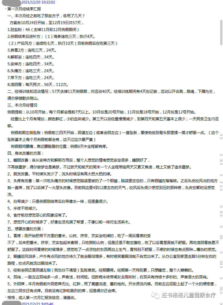 ***** 2021/12/20 10:22:02第一次月经结束汇报一、本次月经之前吃了那些方子,各用了几天?方案自10月24日开始,至12月19日共57天,1.驻盐粉:46(去掉11月和12月例假期间)2.例假结束后进补方:(1)海参连吃三天,执行4天。(2)产后风方:连续吃七天,执行10天(目前例假后在吃第三天)3.养胃2方:连吃三天,24天。4.解郁茶:连吃四天,34天。5.安神方:连吃四天,34天。6.头痛方:连吃三天,24天。7.带下方:连吃三天,24天。8.滋阴膏:每天两次,56天,112次。二、经络训练和运动情况:57天去掉11天例假期,共运动40天。经络训练期间有4天忘记做,运动以开合跳,跳绳,下蹲为主,偶尔穿插散步爬山。三、本次月经情况例假提前:从10月开始,每个月都会提前7天以上。10月份是20号开始,11月份是18号开始,12月份是12号开始。经量比上个月有增加,颜色鲜红,小的血块减少。第三天以后经量慢慢减少,到第四天和第五天基本上很少,一天两条卫生巾足够。例假前期左侧坠胀:例假前三四天开始,阴道左边(或者会阴左边)一直坠胀,要使劲按到骨头那里揉一揉才舒服一点。(这个坠胀基本上每个月例假前都会有,这不过这次最严重)例假期间腰痛,靠近腰骶骨的位置,例假6天中全程都有疼。四、身体改善的方面:1、睡眠改善:自从安神方和解郁方用后,整个人感觉的情绪感觉安定很多,睡眠好了,不再做噩梦,偶尔做梦也是美梦。不过昨天和前天的周末一个人全程带娃两天又累又焦虑,晚上又做了追杀噩梦。2、脱发改善。平时掉头发少了,洗头时候没有再大把大把的掉。3、头疼有改善:第一次吃头痛方的时候感觉脑袋里被扔了一个钢镚,脑袋里空空的,只有钢镚在嗡嗡转。之后头皮吹风冷的地方就一直痒,挠了以后掉了一大层头皮像。目前我这里4到12度左右的天气,吹风后头很少感觉到压的那种疼,头皮也暂时没感觉凉。4、白带减少:只是例假刚结束后白带像水一样,但是量很少。5、半夜干咳减少。6、食疗前总感觉恶心的现象没有了。7、感觉开心的时候多了,好像生活充满了希望,不像以前一样对生活麻木。五、想要改善的方面:1、胃疼:刚开始把带下方里的薏米、山药、茯苓、芡实全吃掉的,吃了一周后胃疼的受不了,后来把薏米、茯苓、芡实包起来煮粥,只吃粥和山药,但是还是不敢空腹吃,吃了以后胃里面就不舒服。再吃滋阴膏就更不舒服了。这段时间胃疼的时候增多,感觉吃了一点凉性的东西再加上生气,胃特别不舒服,不疼的时候也有点那种....嘈杂的感觉。2、眼睛迎风泪多,户外有点风的地方待久了就会眼泪增多,有时候笑着眼泪就不自觉出来了。从办公室到家里走路5分钟左右的路程,吹点风就流出眼泪来了。3、经前会阴还是阴道左侧(我也分不清楚)坠胀难受。经期腰疼。经期第一天特别累,只想睡觉,整个人懒懒的。4、耳鸣,一般左边耳鸣多一点,声音浅,时间短。但昨晚半夜带闺女去厕所时,右耳朵有持续十多秒的、声音很大的耳鸣。5、外阴痒,本月例假前外阴奇痒无比、红肿,用了黄藤洗液、塞的栓剂。开水烫洗内裤。目前左边屁股上起了一个大的硬疙瘩,左边三阴交还有点痒。目前没有红肿和剧烈的痒,但是偶尔还会痒。