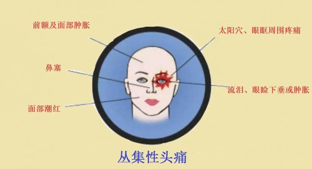 发作时常无先兆,头痛固定于一侧眼及眼眶周围剧烈胀痛或钻痛,并向同侧额颞部和顶枕部扩散,常伴有痛侧眼肌球结膜充血、流泪、流鼻涕、出汗、眼睑轻度水肿等。治疗上与偏头痛基本相同,丛集发作剧烈可给予激素治疗,同时吸氧或高压氧治疗,对部分患者有效。