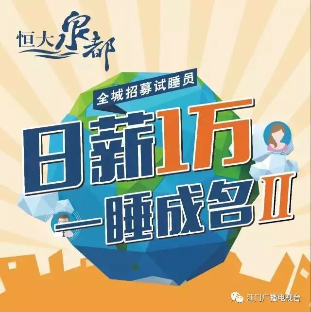 由恒大泉都和江门市广播电视台携手打造的第二季真人秀节目《日薪一万 一睡成名》现正面向全城招募试睡员!即日起至4月26日,20岁以上个人、组合均可报名参加海选,复赛胜出者将参加节目录制,玩游戏,入住恩平恒大泉都,游五国温泉小镇,私享原生态级的居住环境和高端的养生配套资源,成功胜出者还将获得万元奖金!!!名利双收的绝好时机!你还在等什么?赶紧戳下方阅读原文报名吧!1万元奖金等着你!