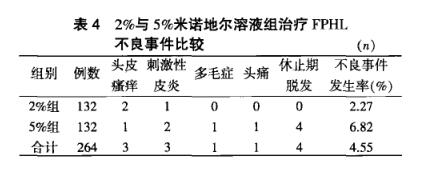 在效果差距不大的情况下,5%米诺地尔副作用相对来说比较明显,我们来看看2%和5%两组治疗方案副作用对比: