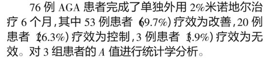 早在17年的时候,《临床皮肤科杂志》上就曾经发布过一篇比较完善的相关研究,实验者共选取男6名,女301名,共307名患者入组,单纯外用2%米诺地尔,每次1ml,每日2次。在6个月内持续复诊,每2个月一次,对全头毛发进行评估。