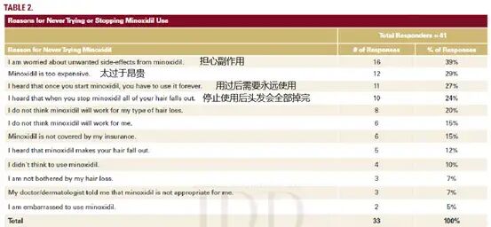 实际上,米诺地尔本身也有一些问题所在,导致了很多人无法坚持使用。针对这个问题,皮肤学家们在今年10月进行了一项大规模的调研,询问了米诺地尔的使用者们为什么没有坚持使用下去。