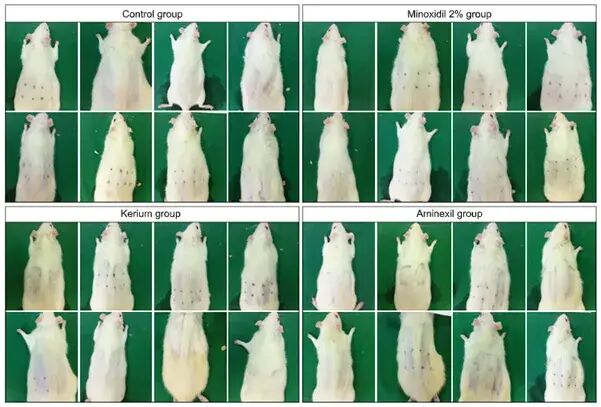 比如说在很多洗护用品中都会用到的亚美尼斯、Kerium成分。这些成分在实际测试中有不错的防脱作用。然而,当二者和米诺地尔共同比较时,其差距就体现出来了。在2016年的一项动物实验中就发现,相较于亚美尼斯和Kerium组,米诺地尔组的效果是更为领先的。