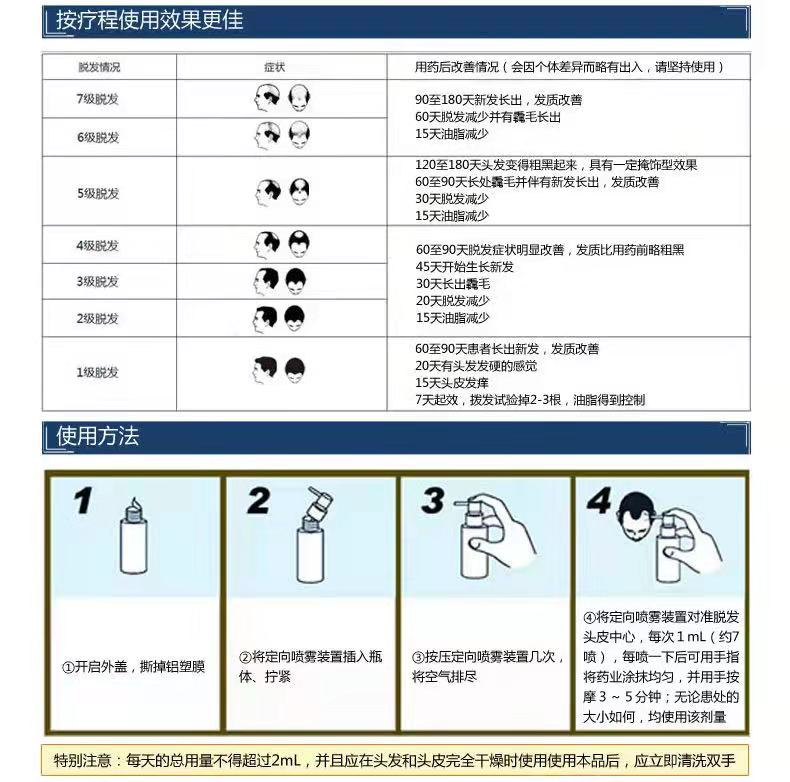 使用时头皮及头发须完全干燥。把脱发区的稀少头发分开,裸露头皮 。将药液直接喷到或涂抹到脱发的头皮上,每次1ml(约7喷)。 每喷一下 ,用手轻怕患处10下,再喷第二下,以此类推 。用后请务必洗手。早晚各一次,就像刷牙一样培养成习惯,晚上安排好时间确保睡觉前头皮已经干燥。