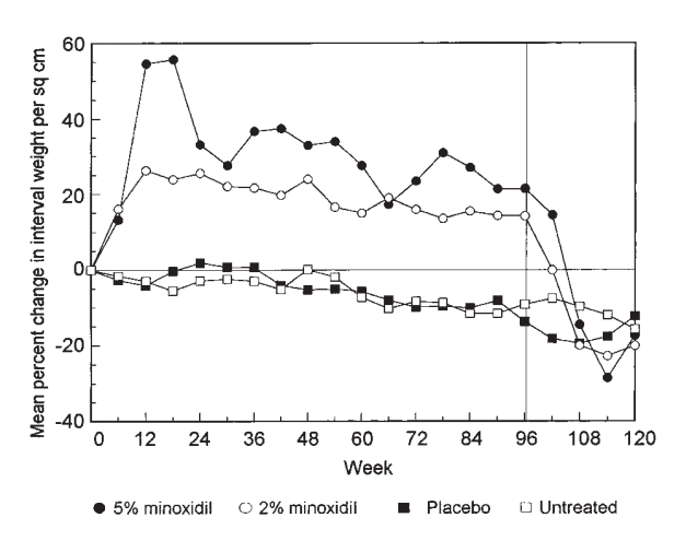 这个图统计的是四个组中,每六周采集一次头发重量相比于开始了治疗时基准头发重量的变化百分比。图中,横坐标代表时间(以周为单位),纵坐标代表每六周采集头发重量相对于基准重量头发的变化百分比。其中黑圆点代表的是5%浓度的米诺地尔,空心圆代表的是2%浓度的米诺地尔,黑色正方形表示的是安慰剂(即涂抹不含米诺地尔的溶液,但是这些人并不知道自己用的是不是真正的米诺地尔),空心正方形代表的是不进行任何治疗的对照组。这是典型的双盲对照实验。实验中,第96周,停止米诺地尔治疗。