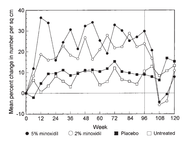 这项研究对分别使用5%浓度米诺、2%浓度米诺、安慰剂和不治疗等四个组的脱发者特定区域的头发的数量和质量进行了为期两年的跟踪,其中头发的质量是指每六周采集一次特定部位的头发进行称重,并且使用米诺地尔者在第96周停止使用。那么他们的头发数量和质量会有怎样的变化和区别呢?