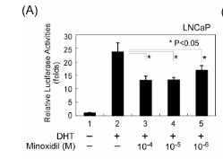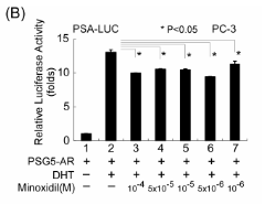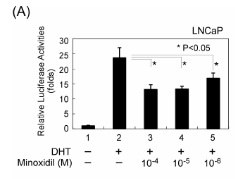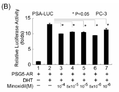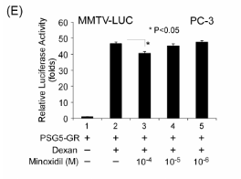 研究首先使用LNCaP前列腺癌细胞(其含有T877A突变的内源性AR)在AR转录报告分析中测试米诺地尔,测试方法:用AR-应答MMTV(小鼠哺乳动物肿瘤病毒)-Luc构建体瞬时转染细胞,并用不同浓度的米诺地尔处理。