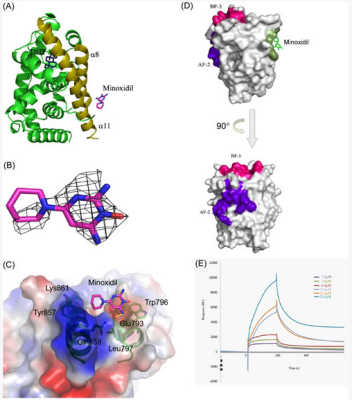 此外,用AR配体结合结构域(LBD)进行的结晶学分析表明,米诺地尔与AR的直接结合是在米诺地尔-AR-LBD共晶体模型中进行的,表面等离子体共振分析表明,米诺地尔直接与AR和aKyvalueof2.6μM结合。
