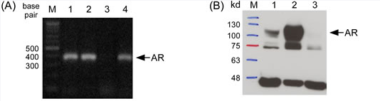 用AR报告法测试了米诺地尔是否对HHDPC(人发真皮乳头细胞)有类似的作用。在mRNA(图A)和蛋白质(图B)水平上证实了AR在HHDPC中的表达。