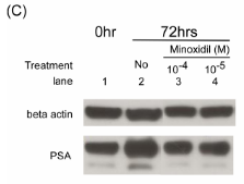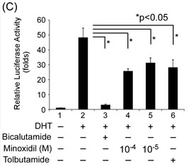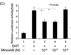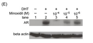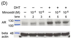 米诺地尔诱导的AR蛋白稳定性的浓度依赖性降低,在DHT不存在的情况下,米诺地尔让雄激素受体表达得到了轻微增强(比较泳道1,2,3,颜色越深代表雄激素受体表达越强);但是在DHT存在的情况下,米诺地尔以浓度依赖的方式降低雄激素受体转录活性(比较泳道4,5,6与泳道2)