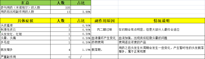 丙二醇过敏我们就暂且不提,因为是个人体质问题,但是表格也说了,只是在初期,后面大多数人就会适应。其实这也是我们头皮建立耐受的一个过程,就像身体需要打疫苗,提前适应疾病的道理一样,所以这种不用担心。