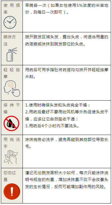 头发生长需要一定时间,这也与脱发情况、个人体质有关,所以米诺地尔使头发再生也需一定时间;研究表明平均起效时间为12周,推荐持续使用6~12个月以上。《中国人雄激素性脱发诊疗指南》建议坚持使用6个月后观察治疗效果。若治疗效果好,应继续使用以维持疗效;如疗效不佳,建议停药。