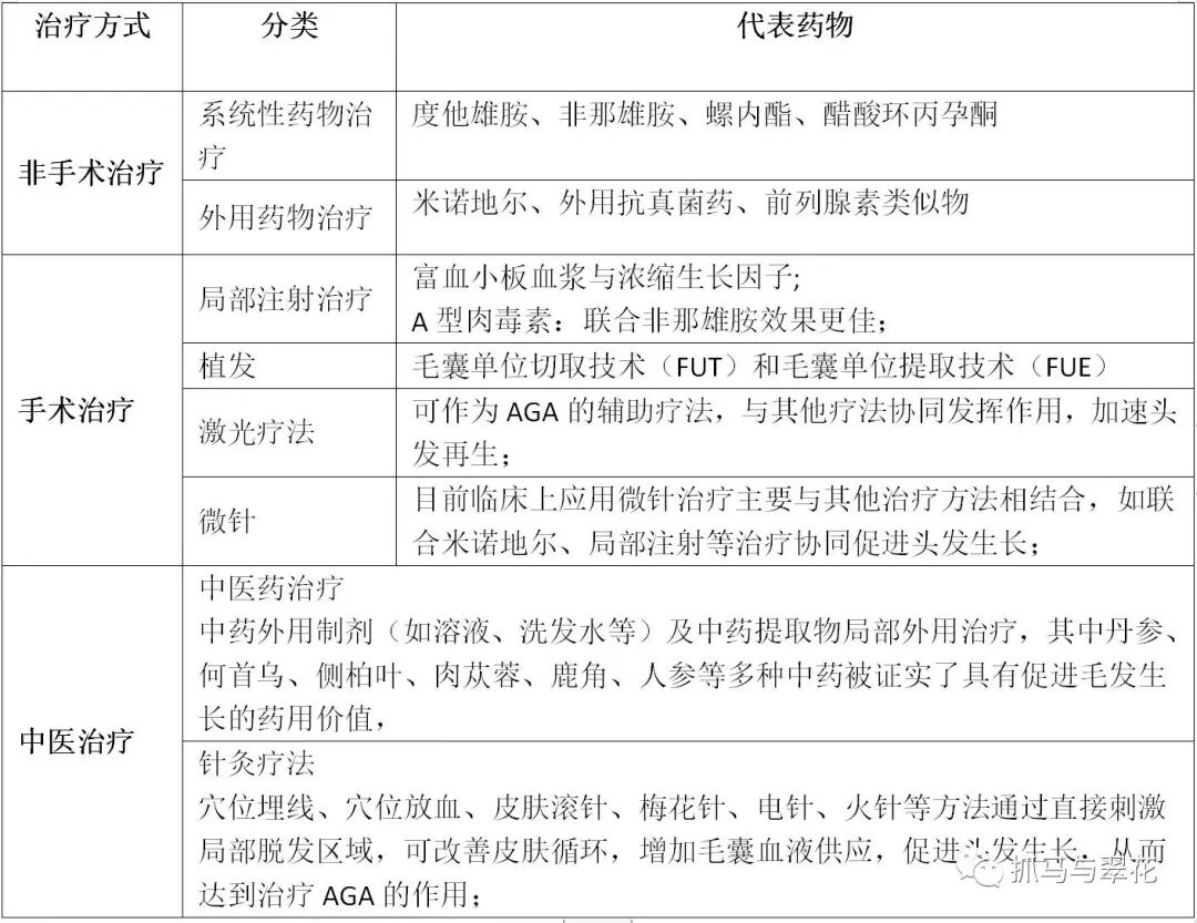 治疗方法具体见下表(非那雄安及度他雄安仅用于男性AGA患者;螺内酯及醋酸环丙孕酮仅用于女性AGA患者)注:AGA治疗周期较长,系统用药及外用药起效时间一般在3~6个月,需要在医生指导下用药,同时需要患者较好的依从性,坚持治疗,树立信心,才是治疗AGA的关键。