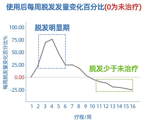 脱发明显是药物开始起效的信号,标志着头发由休止期进入生长期,通常预示着更好的头发生长趋势。米诺地尔诱导毛囊从休止期进入生长期,延长生长期和缩短休止期以促进毛发生长,新长出来毛发的数量和重量均会增加。健康的新头发长出来,凋亡的头发被顶下去,这一过程就容易被误认为是脱发加剧。脱发明显期主要发生于使用米诺地尔后的3-5周,随后情况会逐渐缓解,第12周可以恢复正常,因此不必过于担心。
